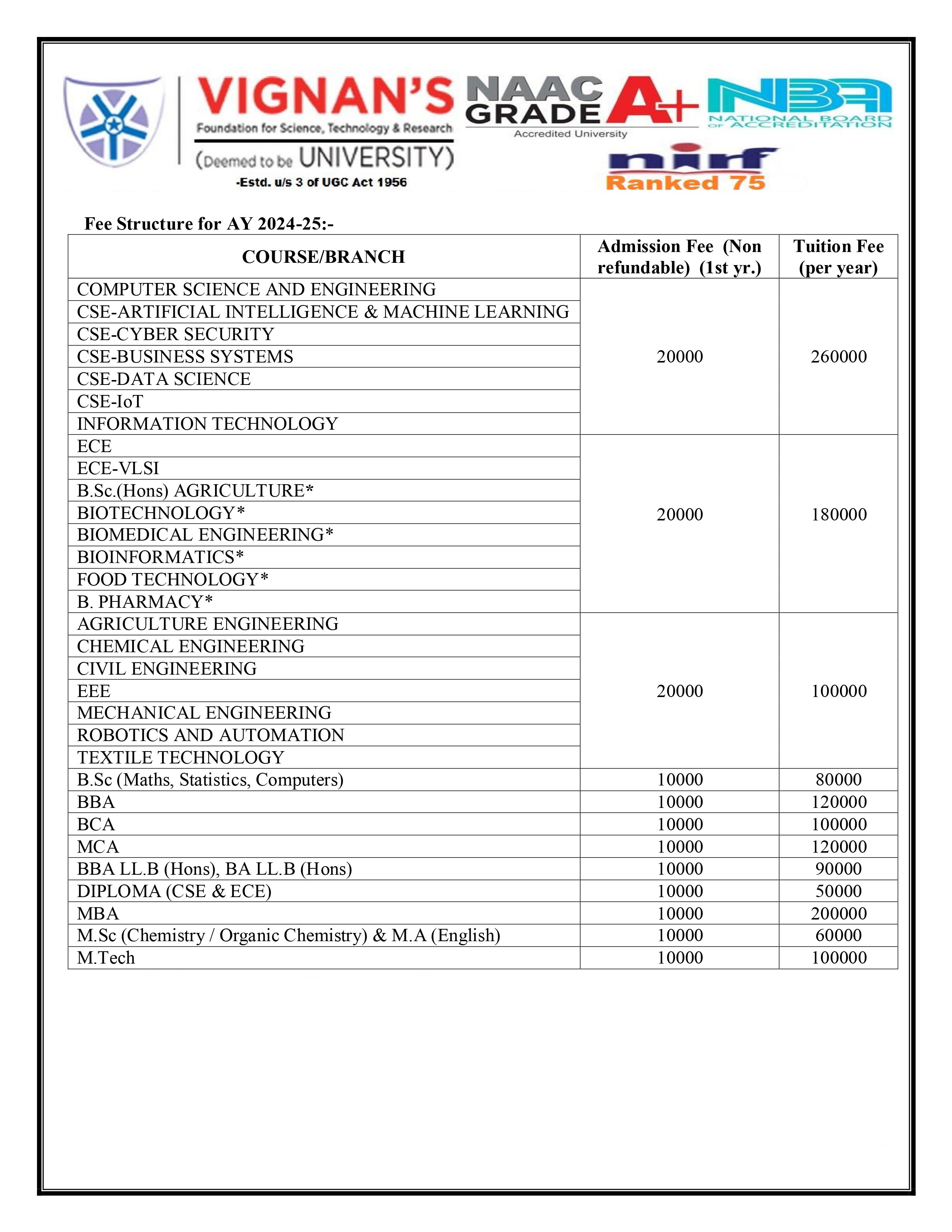 | Accommodation | Hostel fee for year(including registration fee) |